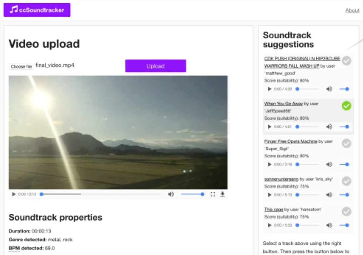 An application to replace a video’s soundtrack with copyright-free Creative Commons (CC) music using machine learning techniques from Music Information Retrieval (MIR).